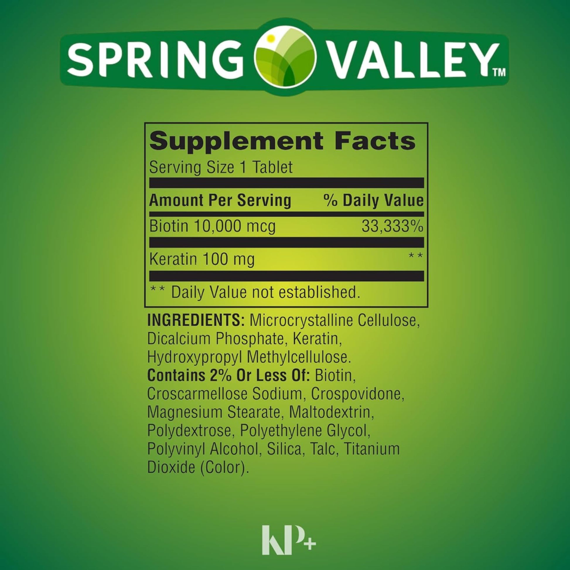 Microcrystalline Cellulose, Dicalcium Phosphate, Keratin, Hydroxypropyl Methylcellulose. Contains 2% or less of: Biotin, Croscarmellose Sodium, Crospovidone, Magnesium Stearate, Maltodextrin, Polydextrose, Polyethylene Glycol, Polyvinyl Alcohol, Silica, Talc, Titanium Dioxide (Color).